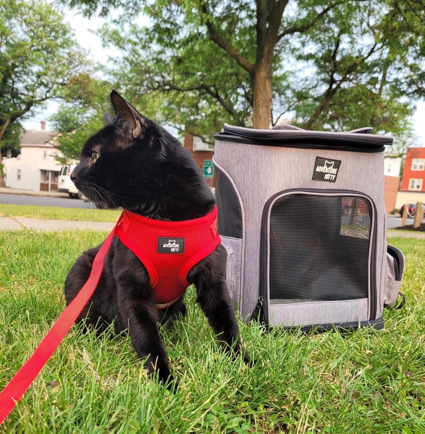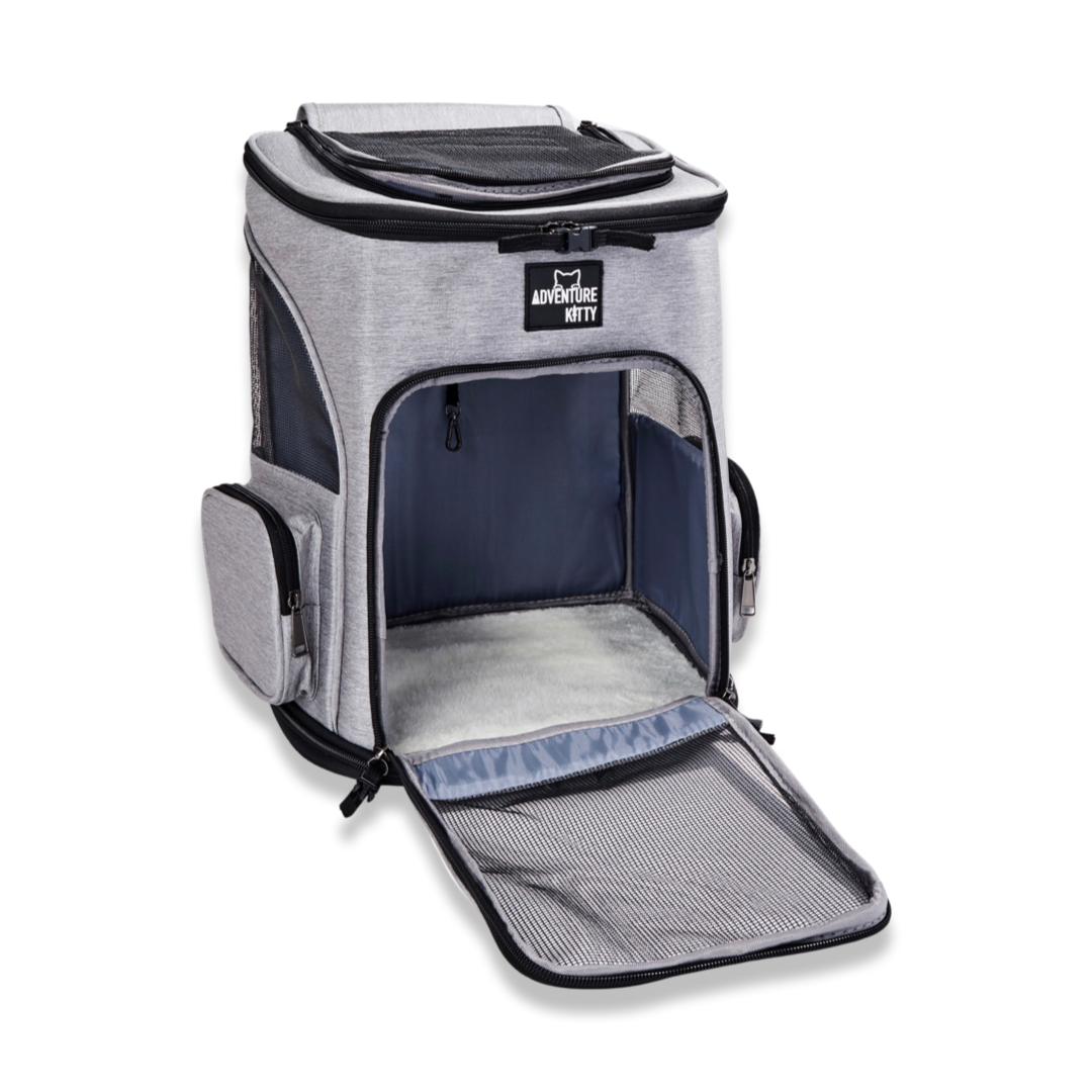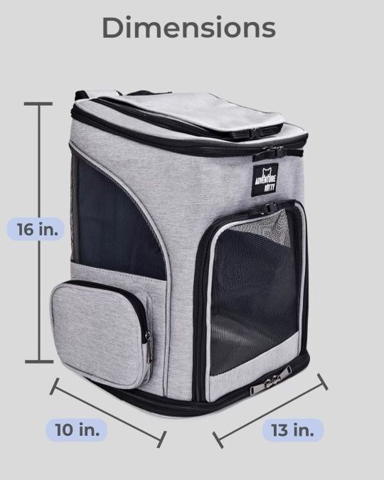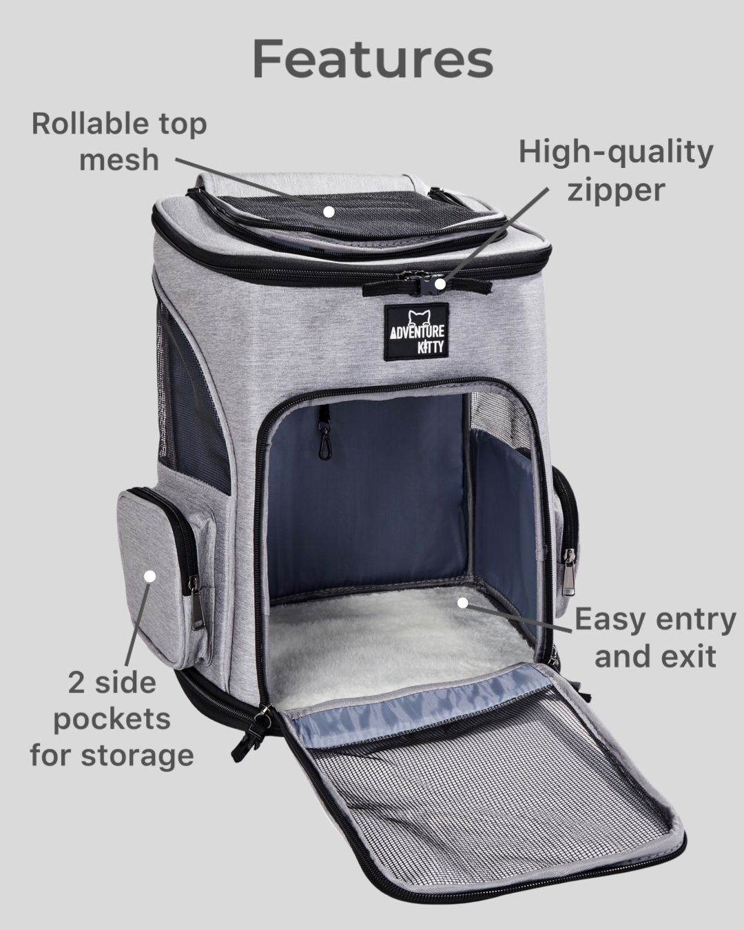 The MeowCat backpack is designed with durable, scratch resistant mesh on 3 sides. Top mesh design ensures ventilation and visibility. Backpack has two separate openings for convenience and ease when placing and retrieving your cat. Also includes two zippered pouches for easy storage of treats or harnesses. Additionally, it comes with leash attachment to safely allow your cat to head out of the top. Easily removable and washable padded mat, gives added comfort to your cat. Perfect for any type of travel to ensure comfort and ease for you and your furry friend!