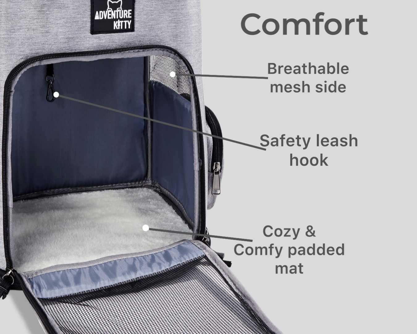 Keep them cool, secure, and snug. Breathable mesh sides deliver steady airflow and visibility, while a built-in safety leash hook helps prevent surprise dashes when you open the bag. Inside, a cozy, comfy padded mat cushions every ride—perfect for naps between adventures.